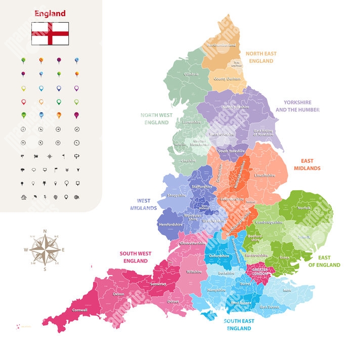 Magnetická mapa Anglicka, administratívna, farebná
