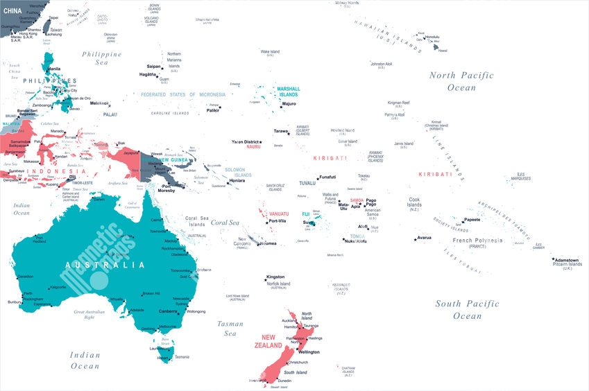 Magnetická mapa Austrálie a oceánie, ilustrovaná, farebná