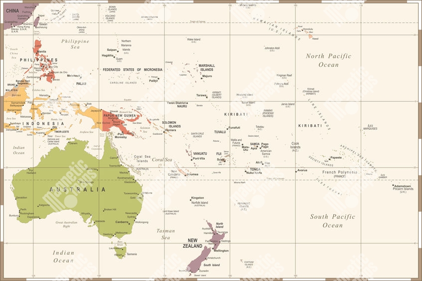 Magnetická mapa Austrálie a oceánie, ilustrovaná, farebná
