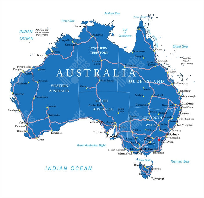 Magnetická mapa Austrálie, cesty, modrá
