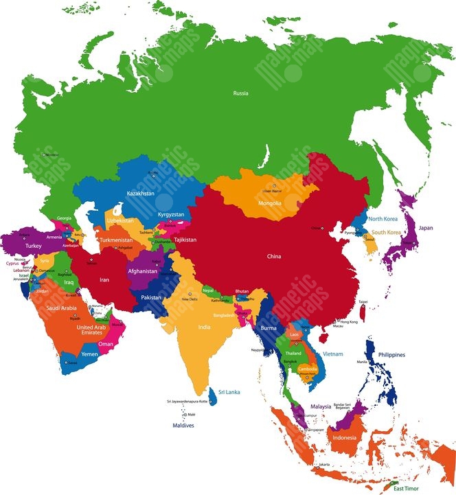 Magnetická mapa Ázie, ilustrovaná, farebná