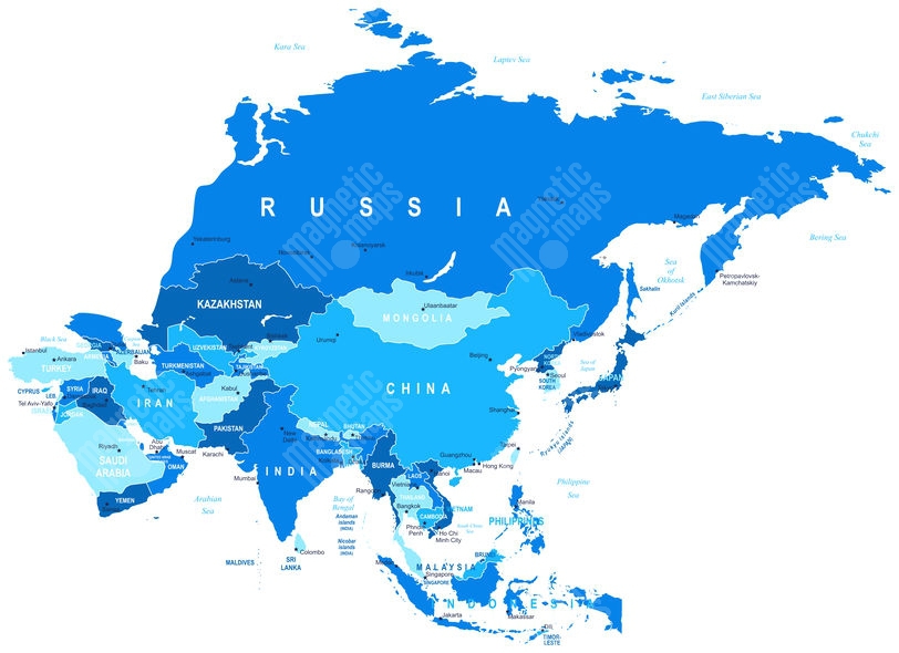 Magnetická mapa Ázie, ilustrovaná, modrá