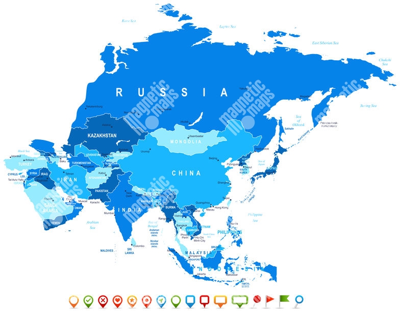 Magnetická mapa Ázie, ilustrovaná, modrá