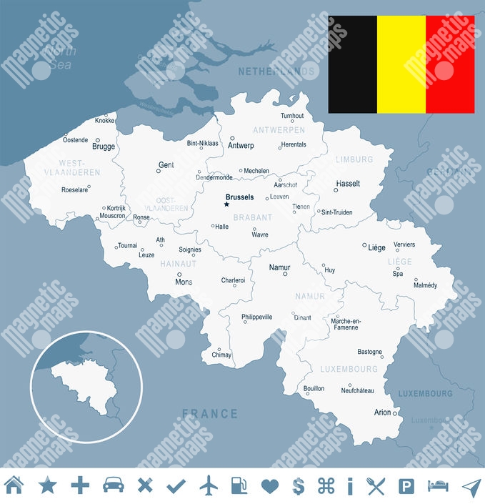 Magnetická mapa Belgicka, ilustrovaná, bielo-šedá