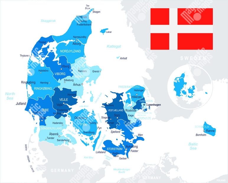 Magnetická mapa Dánska, ilustrovaná, modrá