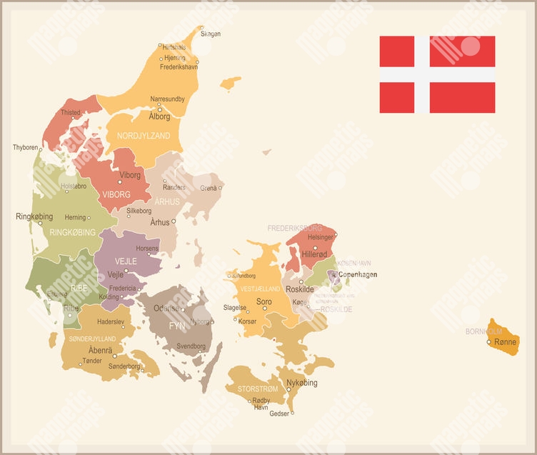 Magnetická mapa Dánska, vintage, farebná