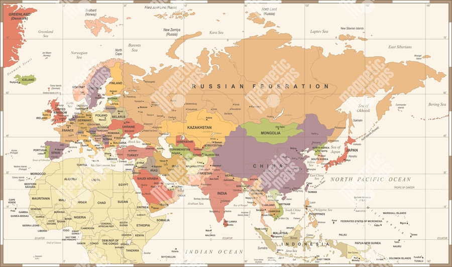 Magnetická mapa Eurázia - Európa a Ázia, farebná