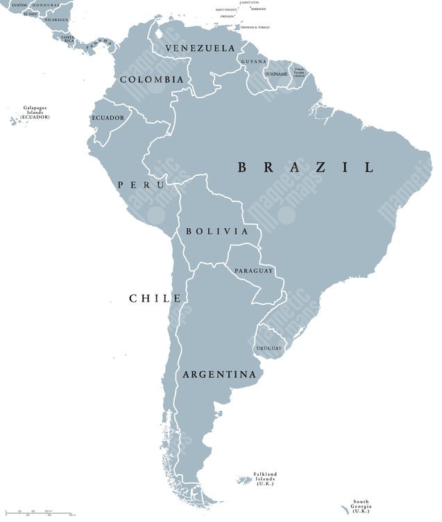 Magnetická mapa Južnej Ameriky, ilustrovaná, bielo-šedá