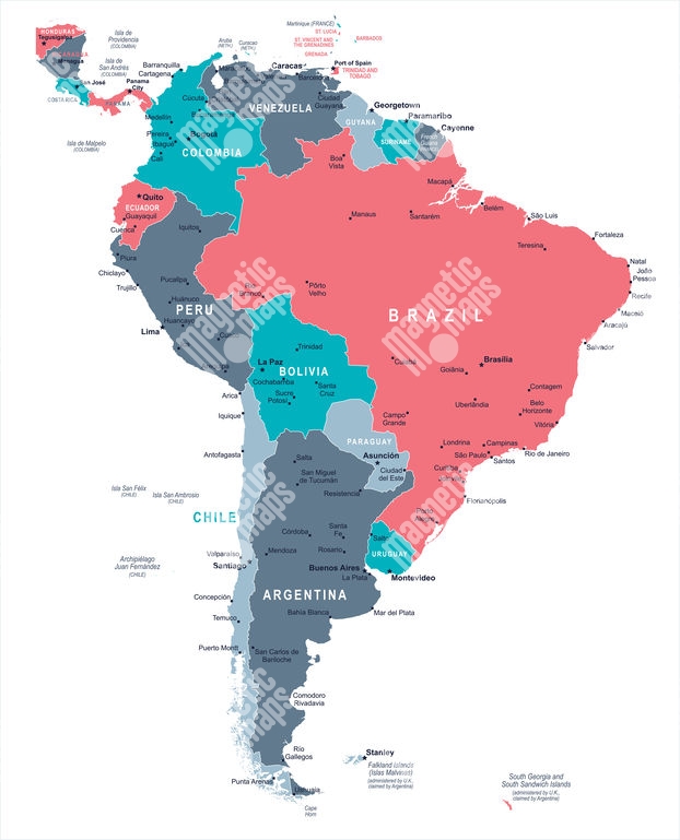 Magnetická mapa Južnej Ameriky, ilustrovaná, farebná