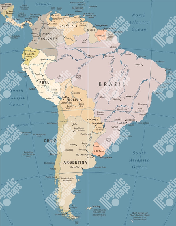 Magnetická mapa Južnej Ameriky, ilustrovaná, farebná