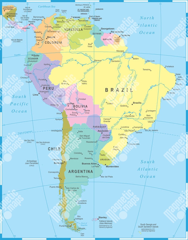 Magnetická mapa Južnej Ameriky, politická, farebná