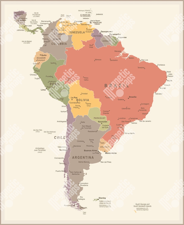 Magnetická mapa Južnej Ameriky, vintage, farebná