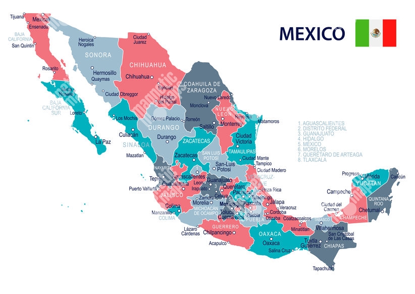 Magnetická mapa Mexika, ilustrovaná, farebná