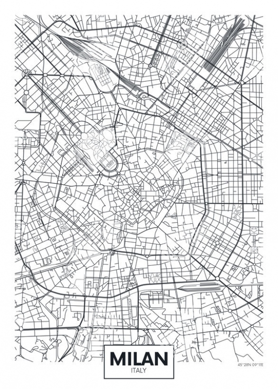 Magnetická mapa Milána, ilustrovaná, čierno-biela