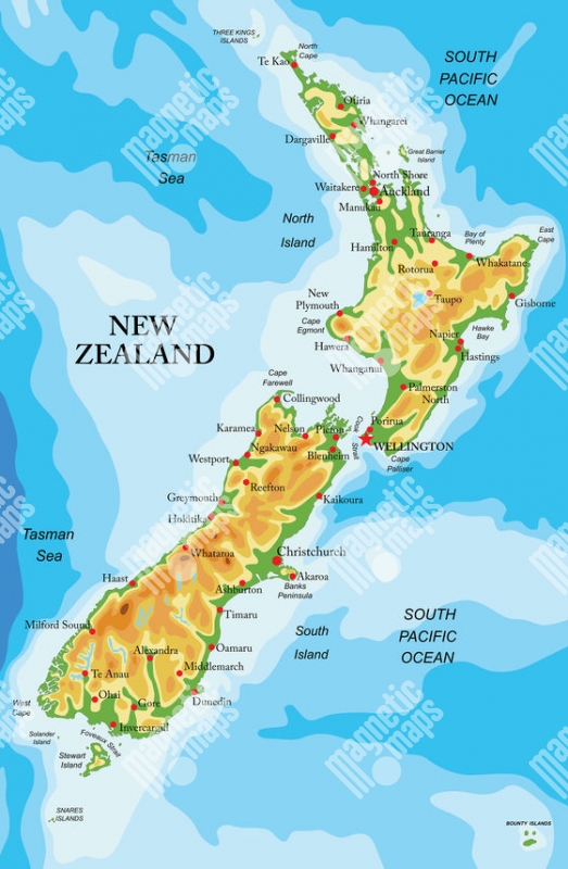 Magnetická mapa Nového Zélandu, geografická, reliéfna