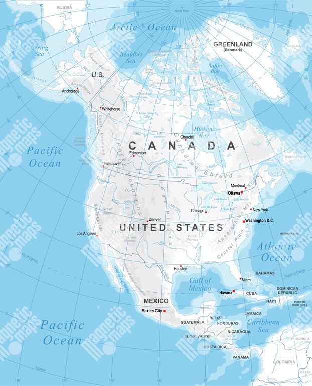 Magnetická mapa Severnej Ameriky, geografická, detailná