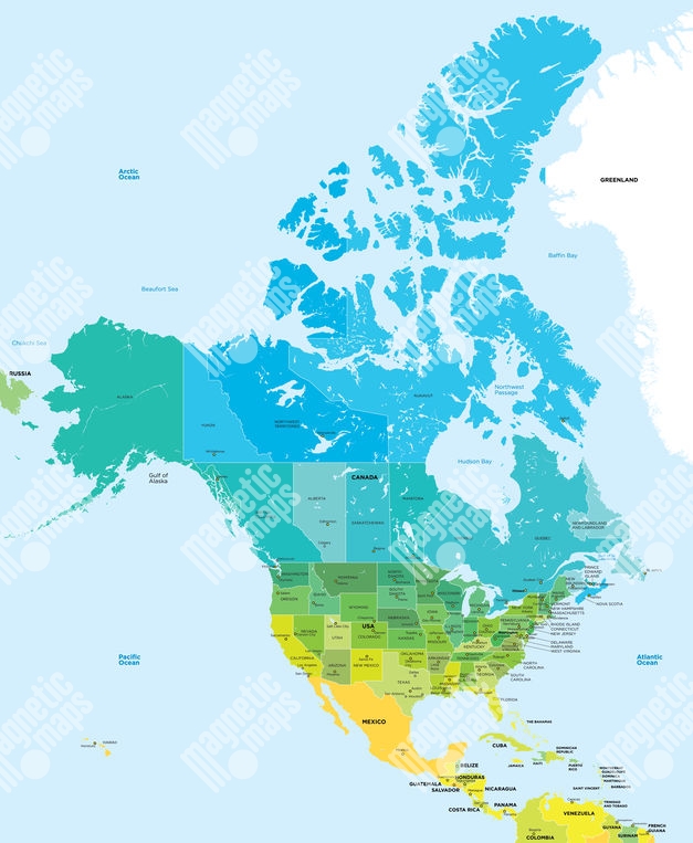 Magnetická mapa Severnej Ameriky, ilustrovaná, farebná