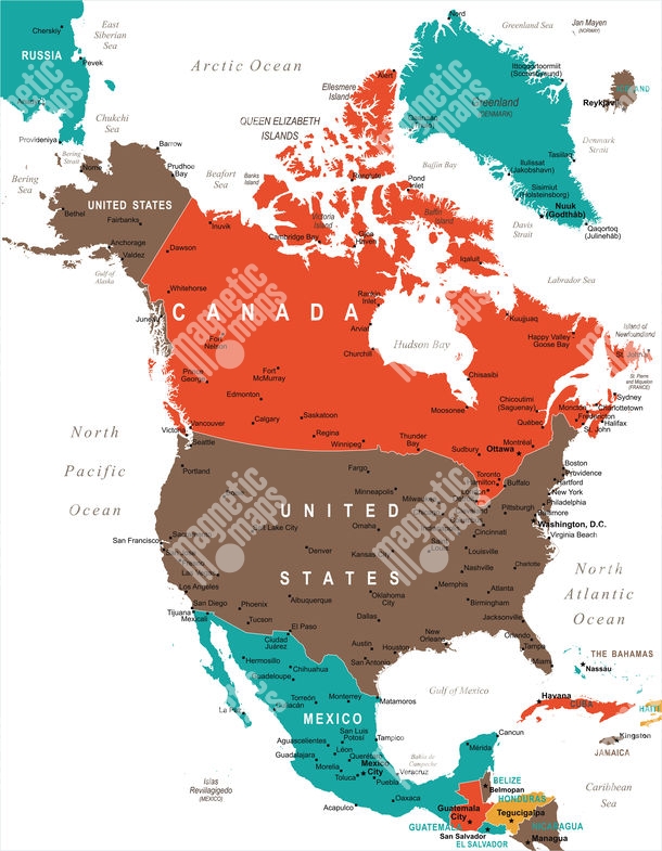 Magnetická mapa Severnej Ameriky, ilustrovaná, farebná