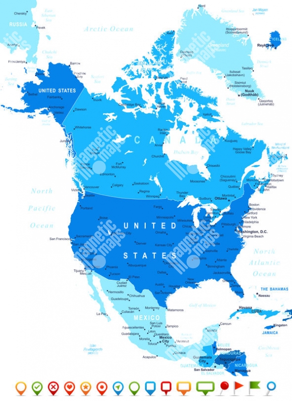 Magnetická mapa Severnej Ameriky, ilustrovaná, modrá