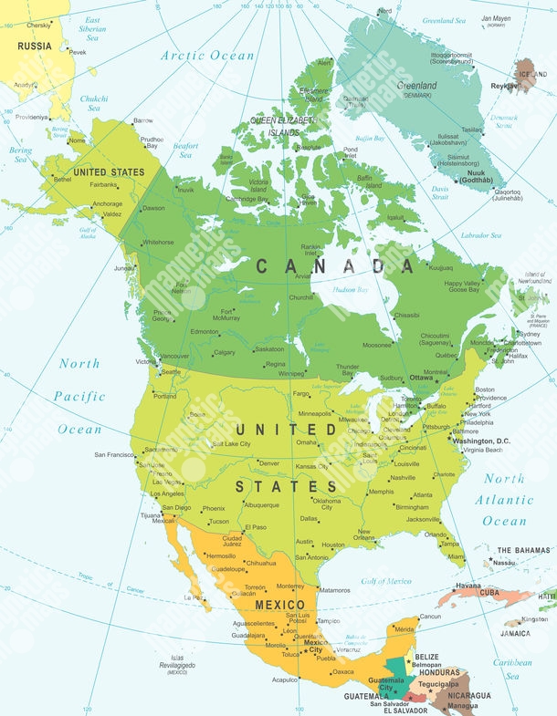 Magnetická mapa Severnej Ameriky, politická, farebná