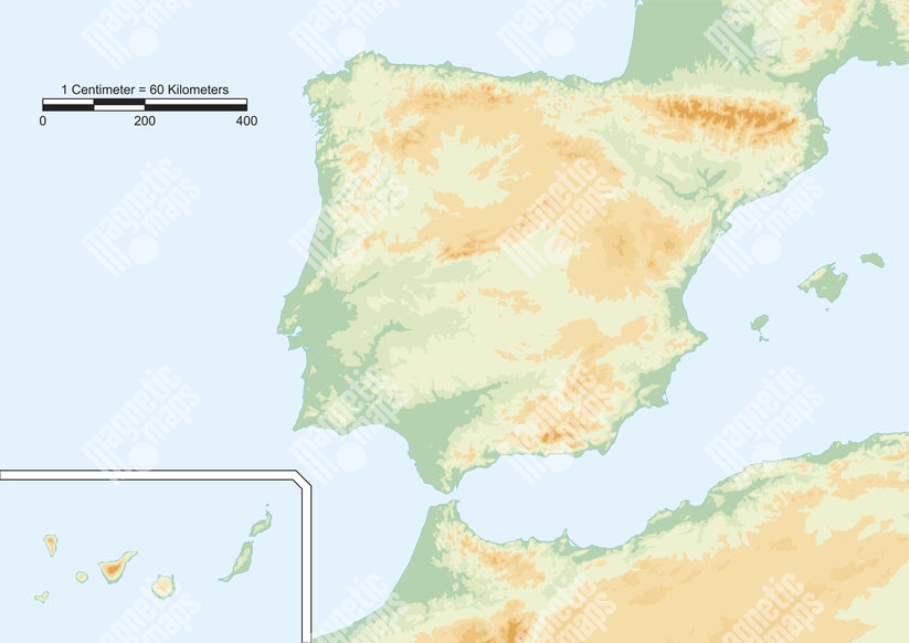 Magnetická mapa Španielska, geografická, bez popiskov