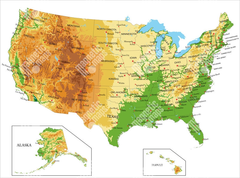 Magnetická mapa Spojených štátov Amerických, geografická, reliéfna