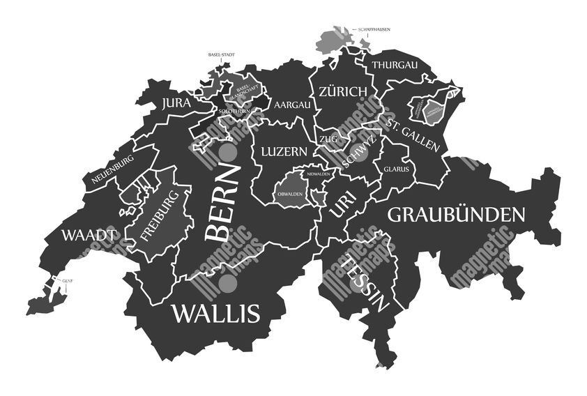 Magnetická mapa Švajčiarska, ilustrovaná, čierna