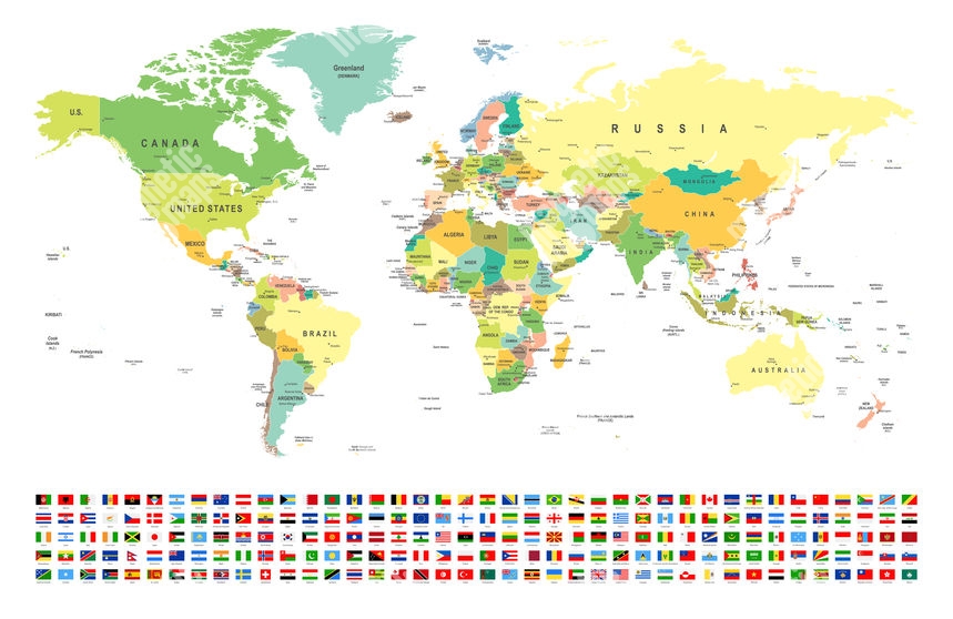 Magnetická mapa sveta, vektorová, s vlajkama