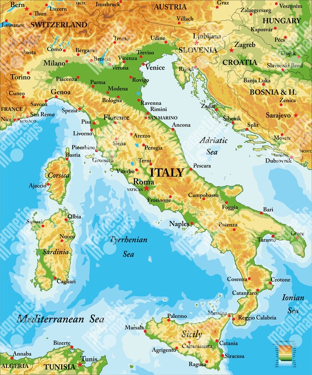 Magnetická mapa Talianska, geografická, farebná