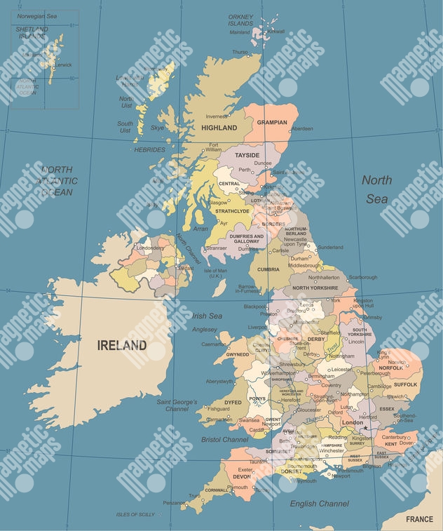Magnetická mapa Veľkej Británie, ilustrovaná, farebná